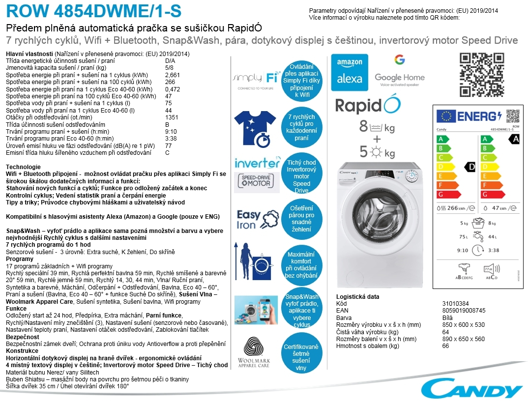 Volně stojící předem plněná pračka se sušičkou řady RapidÓ Candy ROW 4854DWME/1-S v energetické třídě sušení D a praní A na 5 kg sušení, 8 kg praní, 7 rychlých cyklů, ošetření párou, dotykový displej s češtinou, invertorový motor, II. jakost - kosmetické