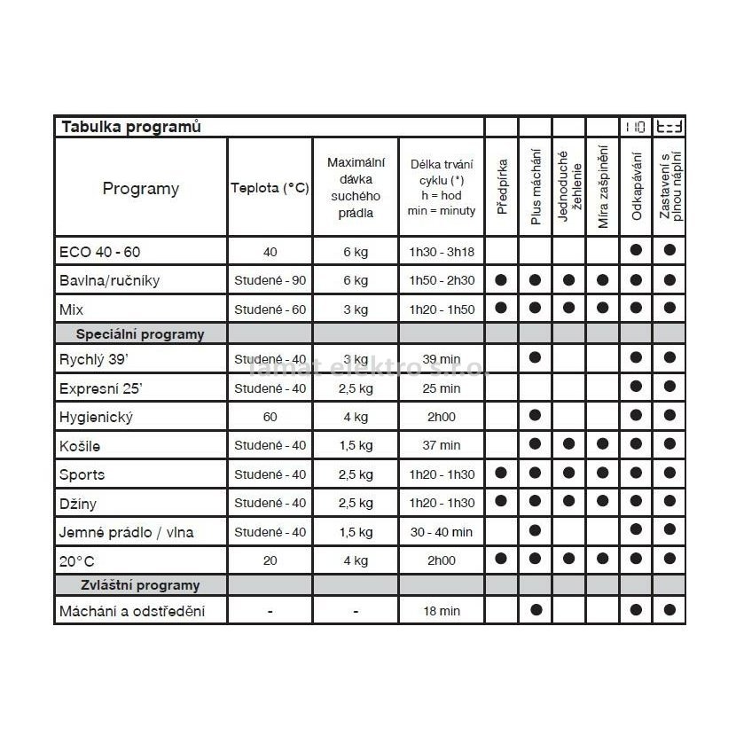 Funkce: předpírka, přidané máchání, bez odstředění, zastavení s vodou v bubnu, nastavení intenzity praní, snadné žehlení